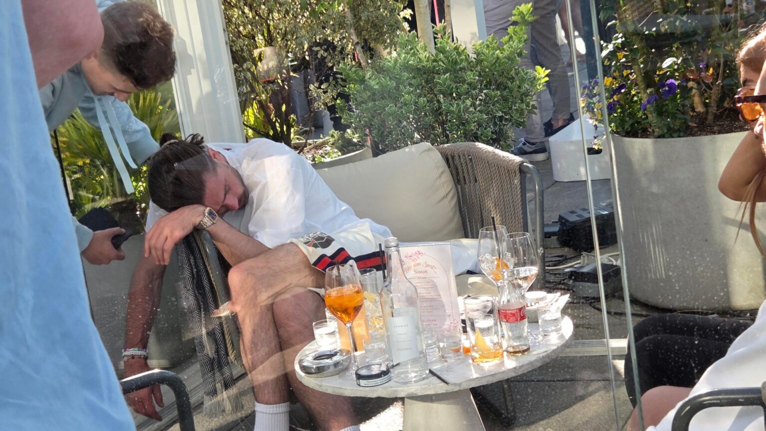 INJURED England ace Jack Grealish nods off at a rooftop bar while boozing with pals.