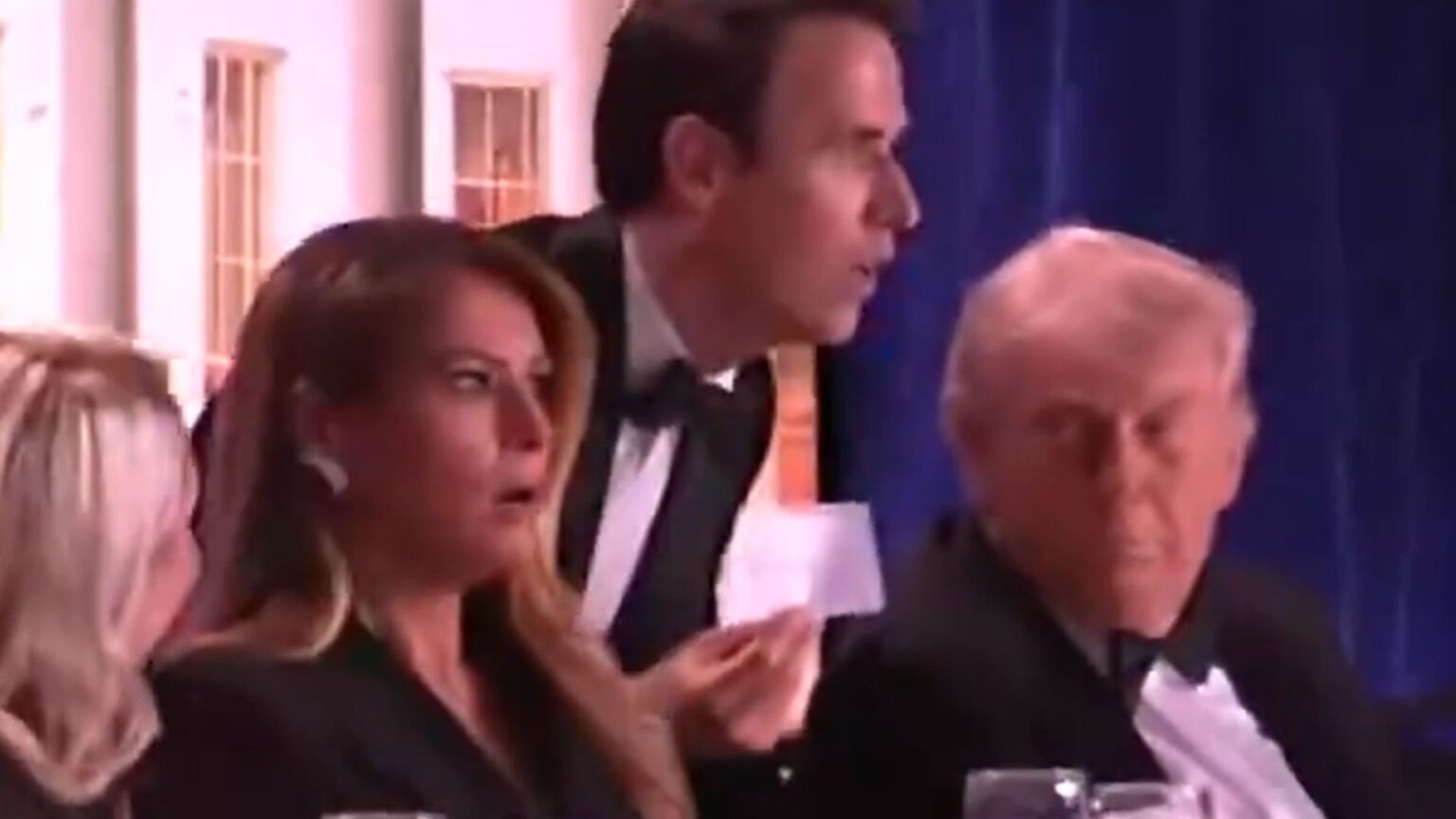 Chilling video from Donald Trump’s correspondents’ dinner shows the president and his wife sat at the dais at the front of the Washington Hilton as a shooting broke out in the venue.