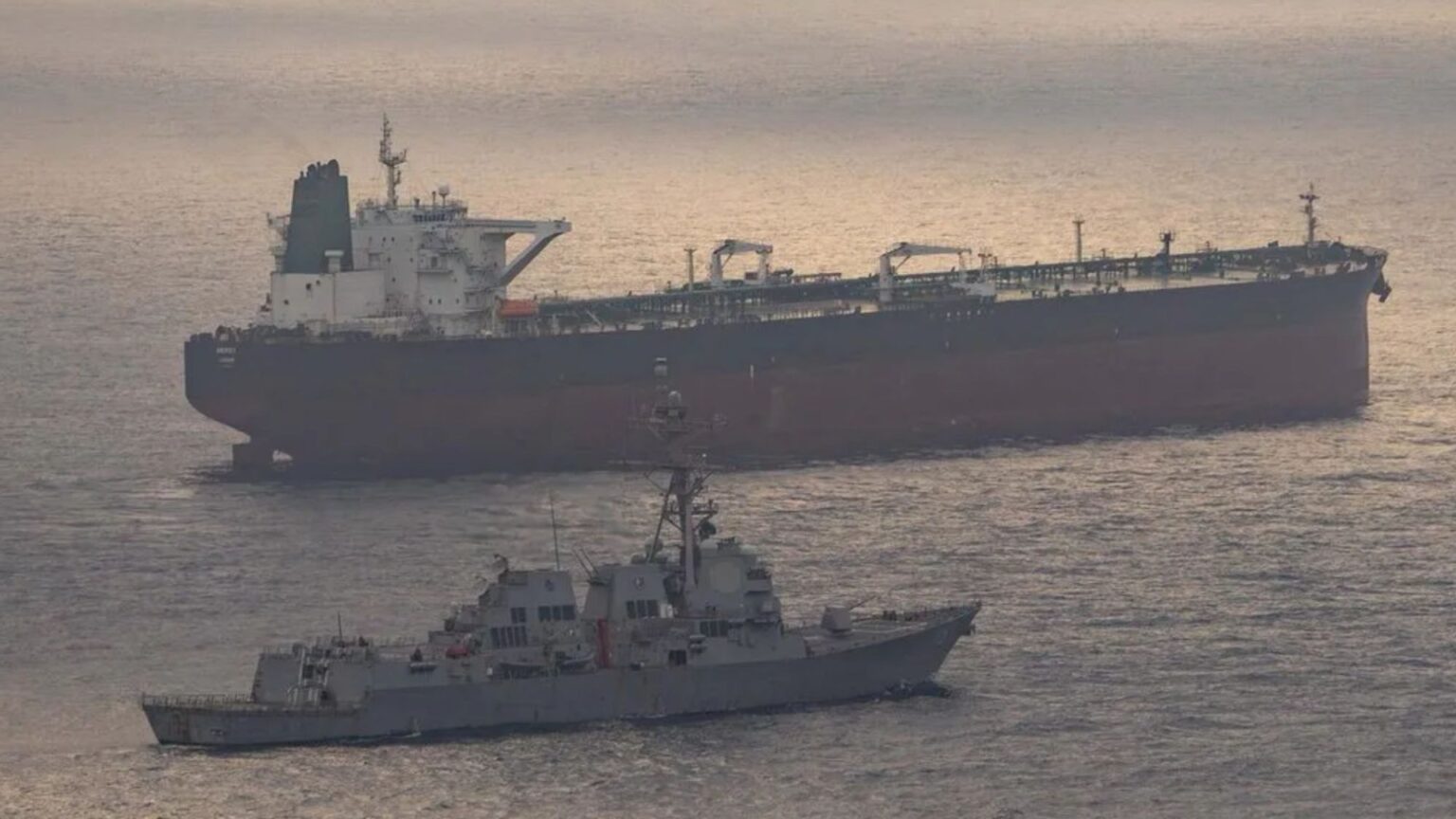 A US Navy guided-missile destroyer intercepts a tanker trying to sail to a port in Iran.