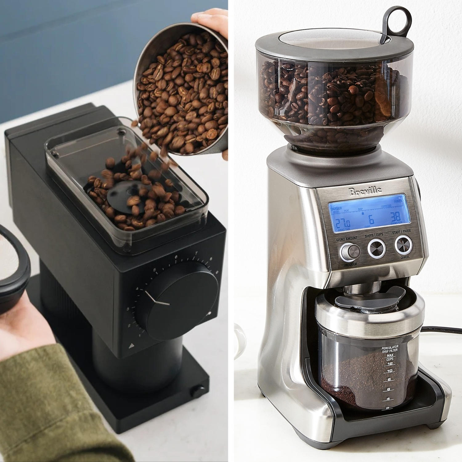 One thing that many coffee drinkers don’t realize is that a quality brew comes down to more than just the beans. Though your beans can certainly be the difference between a swoon-worthy sip and something you’d rather spit out, the equipment you use to prep that cup of joe can also impact how it turns out, especially when it comes to the grinder.Coffee grinders are used for brewing all types of beverages, including drip coffee, cold brew and espresso. “A grinder is literally the most important piece of coffee brewing equipment you can buy,” says Jiyoon Han, a certified Q grader coffee sommelier of Bean & Bean Coffee. “I can brew great coffee in just a mason jar with a filter if I have a good grinder.”So whether you want to make your drinks at home or in the office, you’ll need quality tools. To find the best coffee grinders, we spoke with coffee experts to learn more about the different types of appliances. They also shared their favorite grinders for every type of brew.What are the types of coffee grinders?Before we get to our picks it’s important to note the types of coffee grinders first: the two main options are blade and burr. Burr grinders use burrs or “discs” to break down the beans and are much more commonly recommended by experts because they grind coffee into more uniform pieces in many types of textures. Blade grinders don’t have the level of customization (more or all of this below). The main types of burr grinders are flat and conical burrs. Flat burrs use flat discs to grind coffee while conical ones use a cone-shaped mechanism. We included a mix of both types of burr grinders below. The best coffee grinders of 2026Below, we rounded up our experts’ recommendations for the best coffee grinders, and all (except one) are burr grinders.Best coffee grinder under $200Type: conical burr | Dimensions: 5 x 5.9 x 13.4 in. | Grind settings: 40 | Warranty: 1 yearWhat we likeHas a lot of settingsGreat for coffee and espressoThe Baratza Encore is a highly-rated conical burr grinder that customers praise for having a wide range of grind settings. John Holmquist, customer experience manager at Seattle Coffee Gear, also recommends this pick, saying that it’s a ”great option for households that use multiple brew methods.” The first 20 settings are meant for brewing espresso, while the settings 21 to 40 are best for brewing coffee, including for drip and pour over. To adjust the grind settings, all you have to do is twist the hopper on the top. It also has a 10.6-ounce capacity, an on and off switch on the side and a pulse button on the front.Best blade coffee grinderType: blade | Dimensions: 6.5 x 4.5 in. | Grind settings: n/a | Warranty: 1 yearWhat we likeAffordableGreat for coffee and espressoIf you don’t care much about having multiple grind settings, this blade grinder from Bodum is a great option, and it’s affordable. Around the size of a drinking glass, the grinder has a compartment on the top to grind the coffee (up to 60 grams). You just press the button on the top to pulse and grind until it reaches the texture you prefer. Best single-dose coffee grinderType: flat burr | Dimensions: 9.4 x 4 x 9.7 in. | Grind settings: 11 | Warranty: 2 yearsA popular conical burr coffee grinder, the Fellow Ode Gen 2 is a powerful appliance with capacity of 100 grams. It’s meant for making brewed coffee, including pour over, French, press, cold brew and drip, and it has low noise, according to the brand. It has a 1-meter-long power cord and it isn’t as tall as the previous model, making it easier to fit in a small kitchen. Holmquist, recommends this option and says that it’s a great option for people who enjoy making different types of coffee, as opposed to just espresso or drip.Best minimalist coffee grinderType: conical burr | Dimensions: 8.2 x 5 x 10.5 in. | Grind settings: 41 | Warranty: 2 yearsWhat we likeHas a lot of settingsGreat for coffee and espressoSmall sizeFellow has a great lineup of coffee appliances, including the Fellow Opus, which is a conical burr grinder that has more than 40 adjustable grind settings. You can measure your grind by using the dosing lid, which allows you to prepare up to 12 cups of brewed coffee, according to Fellow. Coffee grinder with the most grind settingsType: conical burr | Dimensions: 6.5 5 x 14 in. | Grind settings: 40 | Warranty: 1 yearWhat we likeHas a lot of settingsLCD displayGreat for coffee and espressoThe Baratza Virtuoso has 40 grind settings for different types of espresso and coffee beverages. It grinds up to 2 grams per second, according to the brand, and has a capacity of 10 ounces. It also has an LED light making it easy to see the grind setting and an LCD display on the front, plus a dial that allows you to choose the grind size.Best smart coffee grinderType: conical burr | Dimensions: 8.5 x 6.3 x 15.3 in. | Grind settings: 60 | Warranty: 1 yearWhat we likeHas a lot of settingsHas a screen18-ounce capacityThis grinder from Breville has more than 50 grind settings and a capacity of 18 ounces. It has a screen on the front to display the grind setting, grind time, the type of coffee you’re brewing and the amount. It also has a button to start and stop the grind process and it allows you to select shots of espresso or cups of drip coffee. You simply adjust the grind size with the dial on the side.Best affordable burr grinderType: conical burr | Dimensions: 6 x 7 x 10.75 in. | Grind settings: 18 | Warranty: 18 monthsWhat we likeEasily adjustableUnder $75Available in many colorsSomething to noteOnly has 18 grind settingsThis option from Cuisinart is a smart choice if you want a conical burr grinder but don’t want to spend a ton of money. It has an 8-ounce capacity and it has a dial on the top that allows you to adjust the grind size and select between 18 settings, which include fine, medium and coarse. It also makes grounds for up to 18 servings of coffee (5 ounces each), according to the brand. Best small b